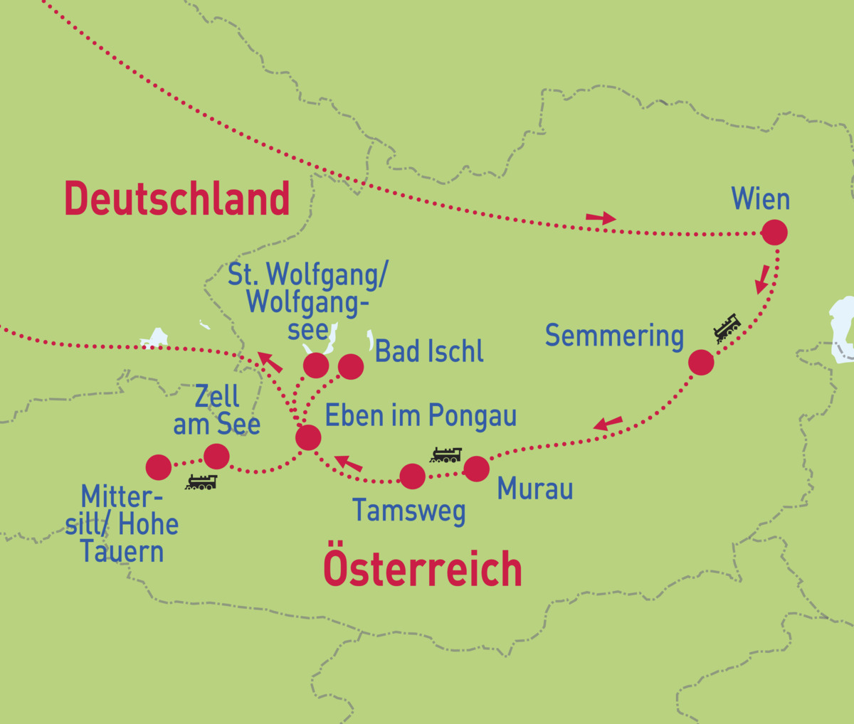 Alpenzauber und Bahnromantik - So. 14.06. - Sa. 20.06.26Alpenzauber und Bahnromantik - So. 12.07. - Sa. 18.07.26Alpenzauber und Bahnromantik - So. 16.08. - Sa. 22.08.26