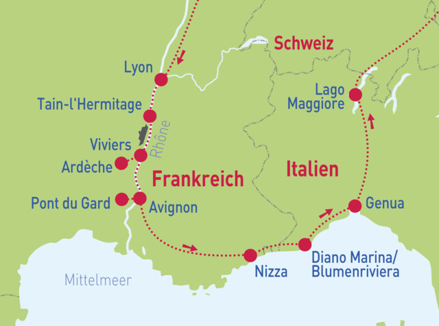 Lyon – Côtes du Rhône – Ardèche – Pont du Gard – Avignon – Nizza – Genua – Lago Maggiore