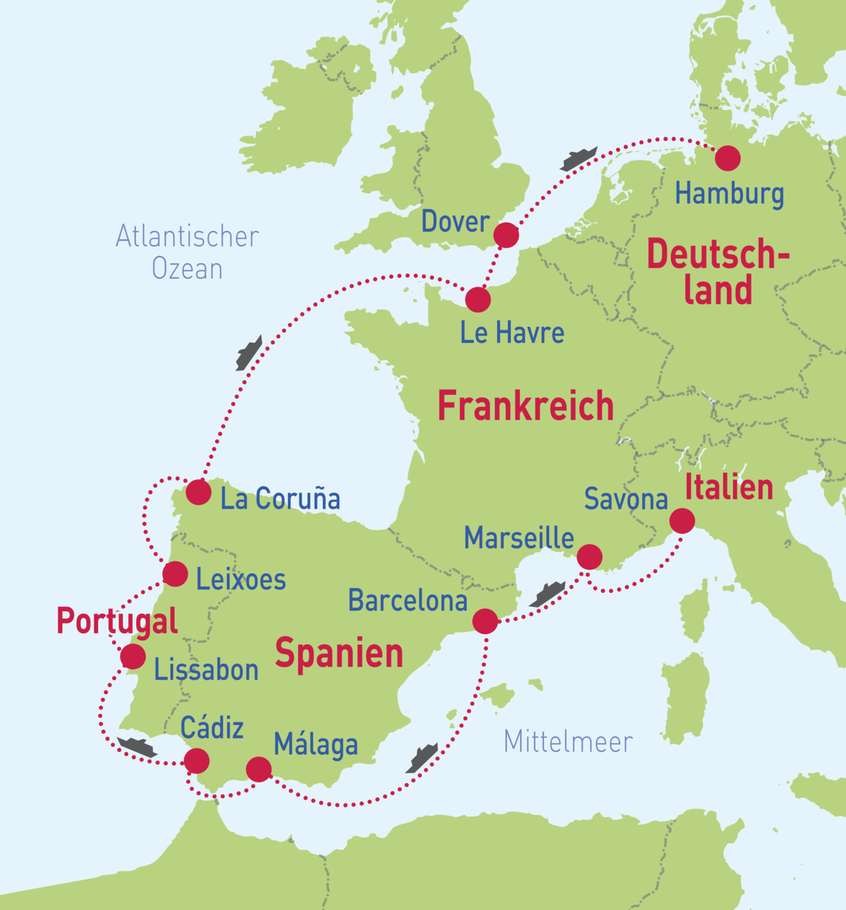 Savona – Marseille – Barcelona – Málaga – Cádiz – Lissabon – Leixoes – La Coruña – Le Havre – Dover – Hamburg