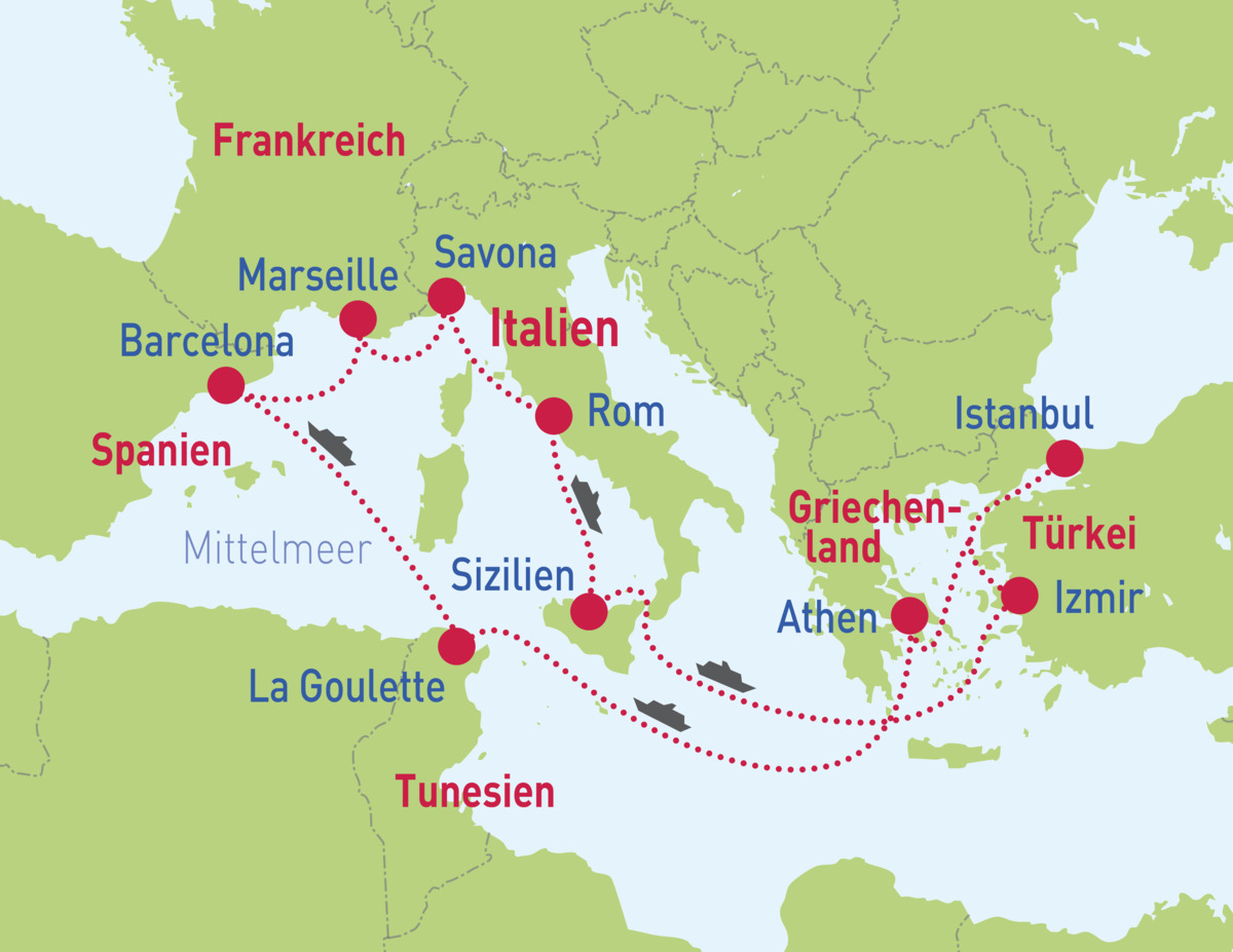Savona – Rom – Sizilien – Izmir – Istanbul – Athen – La Goulette – Barcelona – Marseille – Savona