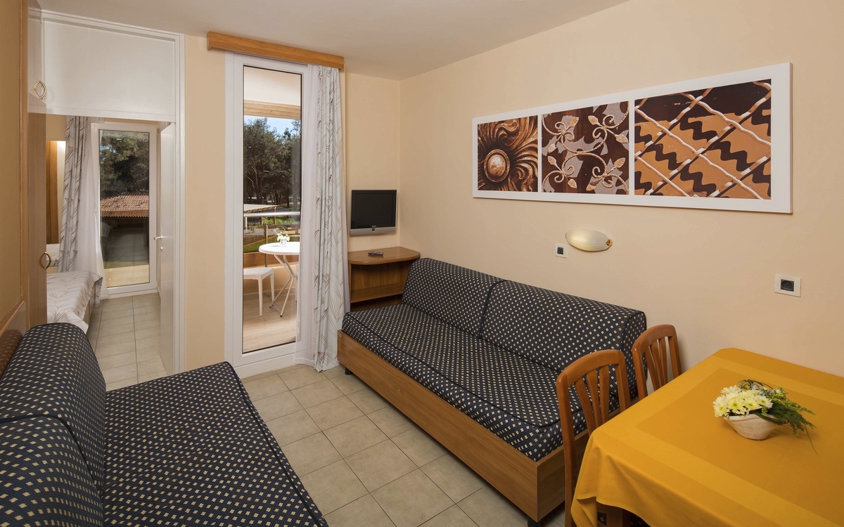 Die ***Apartments "Stella Plava Laguna" in Umag sind Bestandteil des Resorts "Stella Maris" und der perfekte Ort für einen erholsamen Urlaub in Istrien. Die ***Apartments "Stella Plava Laguna" liegen in einer mediterranen Vegetation nur wenige Gehminuten vom Meer entfernt. Das Meereswasser bei Umag ist mit dem Zertifikat "Blaue Flagge" bewertet worden und steht für die außergewöhnliche Reinheit des Meeres und der Strände. Die Anlage "Stella Maris Resort" bietet unterschiedliche Lokalitäten, z.B. das "Stella Maris Restaurant" mit Halbpensionsmöglichkeit (Frühstücks- und Abendessen-Buffet), mehrere Themenrestaurants, Snack Bars und Café Bars. In der Ferienanlage befinden sich ein Meerwasserpool und ein Pool für Kinder. Eine Vielzahl sportlicher Aktivitäten ist möglich, z.B. Wassergymnastik, Pilates, Yoga, Aerobic, Tauchen, Fahrrad fahren u.v.m. (Aktivitäten z.T. gegen Aufpreis vor Ort und saisonal begrenzt) Am Abend finden verschiedene Veranstaltungen wie Liveshows, thematische Abende oder die Auftritte des Animationsteams statt. Die Apartments haben eine Fläche von ca. 28 qm und sind für maximal 3 Personen geeignet. Sie verfügen über Bad oder Dusche/WC, ein Schlafzimmer mit 2 Betten, ein Wohnzimmer mit einem ausziehbaren Sessel, Küchenzeile, Klimaanlage, Telefon, Sat-TV und Balkon.