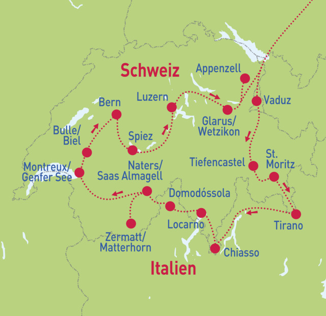 Große Schweiz-Rundreise - So. 14.06. - Mo. 22.06.26Große Schweiz-Rundreise - So. 12.07. - Mo. 20.07.26Große Schweiz-Rundreise - So. 23.08. - Mo. 31.08.26