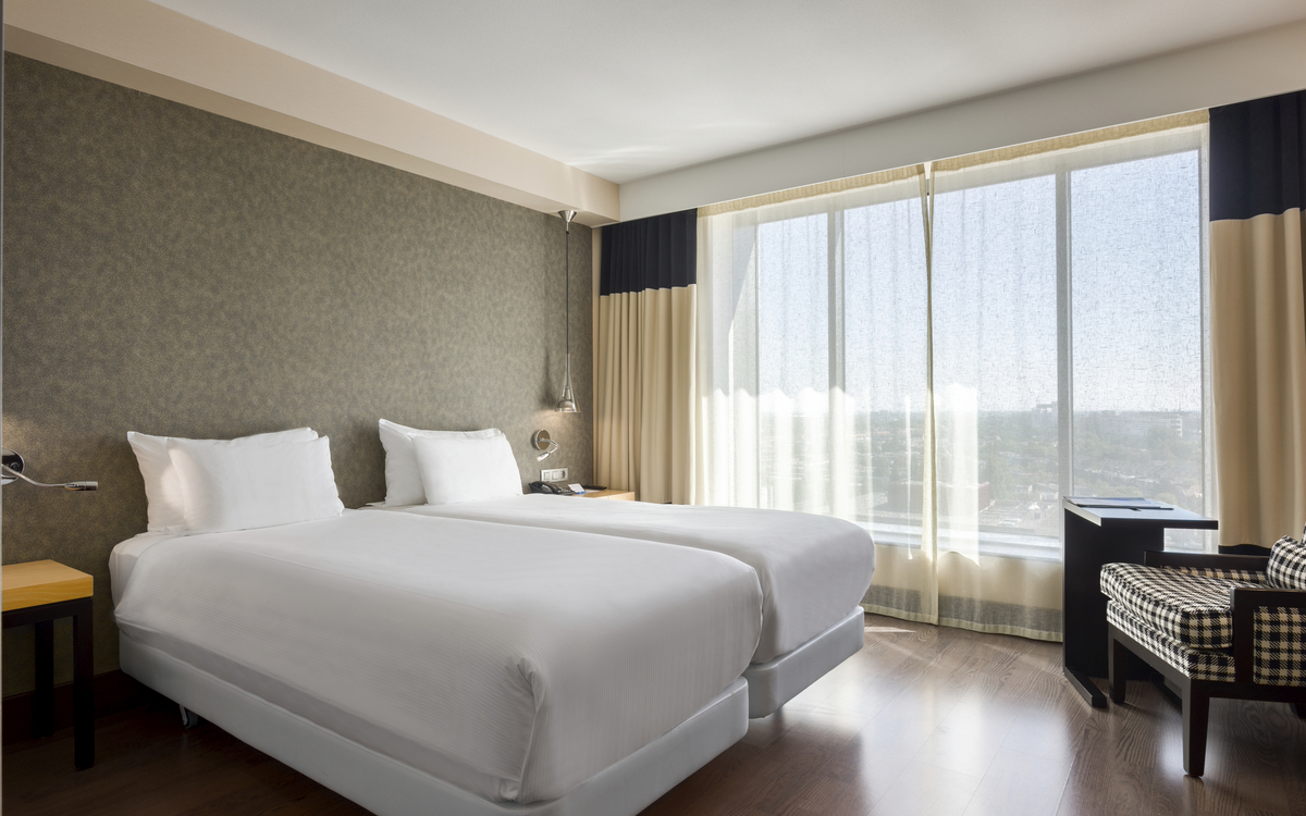 Das ****Hotel "NH Den Haag" liegt neben dem World Trade Center, unweit von den Regierungsgebäuden, Ministerien und des Hauptbahnhofs. Es verfügt über Restaurant, Bar, Lift und WLAN. Die 205 Zimmer sind mit Bad oder Dusche/WC, Haartrockner, Klimaanlage, Telefon, TV und WLAN ausgestattet.