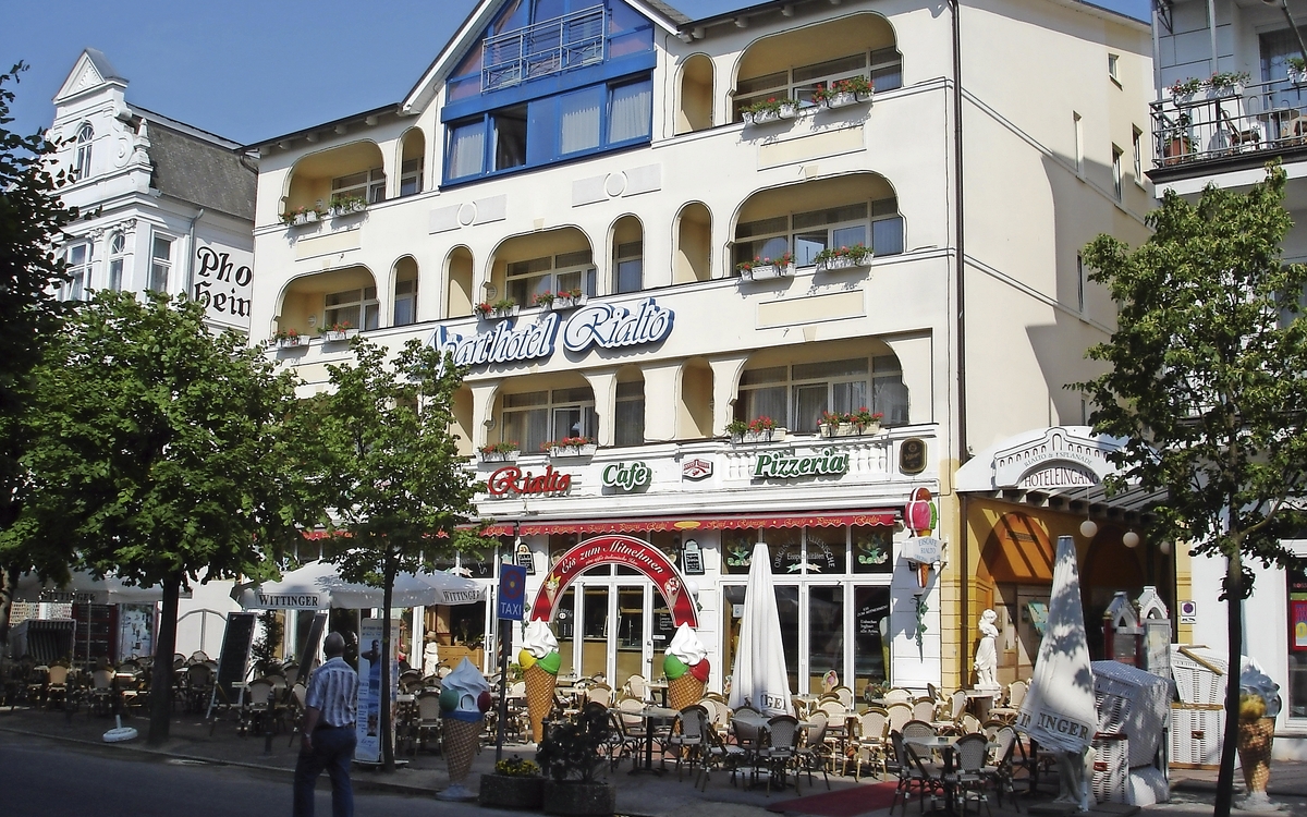 Ihr Aparthotel "Rialto" mit Hotel "Esplanade" in Binz ist nur wenige Meter von der Seebrücke sowie dem Strand entfernt und direkt an der verkehrsberuhigten Einkaufsstraße gelegen. Das Hotel verfügt über Restaurant, Lift und Café. Die Zimmer sind mit Bad oder Dusche/WC, Haartrockner, Telefon, TV und Safe ausgestattet.