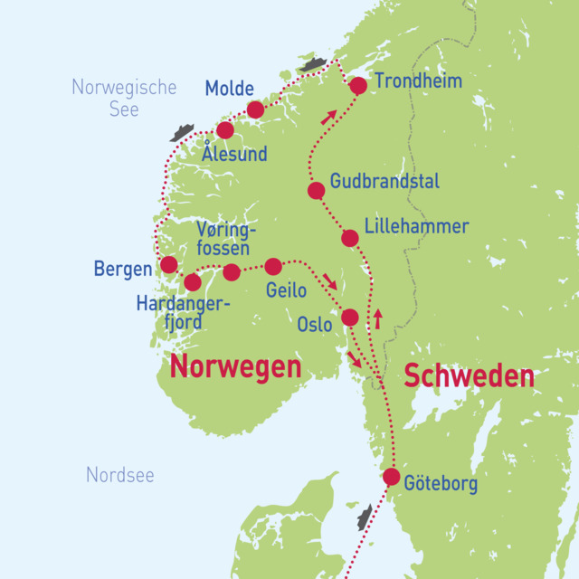 Diese Reise verbindet die schönsten Norwegenerlebnisse miteinander. Neben den königlichen Städten Oslo und Trondheim erkunden Sie bequem mit einem Postschiff der Hurtigruten die eindrucksvolle Küstenlandschaft Norwegens. Somit erleben Sie eine Busreise mit Kreuzfahrtcharakter und Norwegen von der Land- und von der Seeseite. Diese Kreuzfahrt zählt zu der "schönsten Seereise der Welt" und das ist nicht das Einzige. Die Olympiastadt Lillehammer, die bunte Hansestadt Bergen, der berühmte Wasserfall Vøringsfossen sowie der beeindruckende Hardangerfjord sind weitere Höhepunkte unserer Reise.