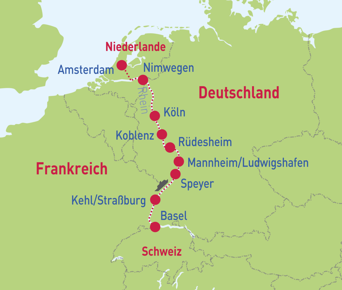 Basel – Straßburg/Kehl – Mannheim/Ludwigshafen – Rüdesheim – Koblenz – Köln – Amsterdam – Nimwegen – Köln