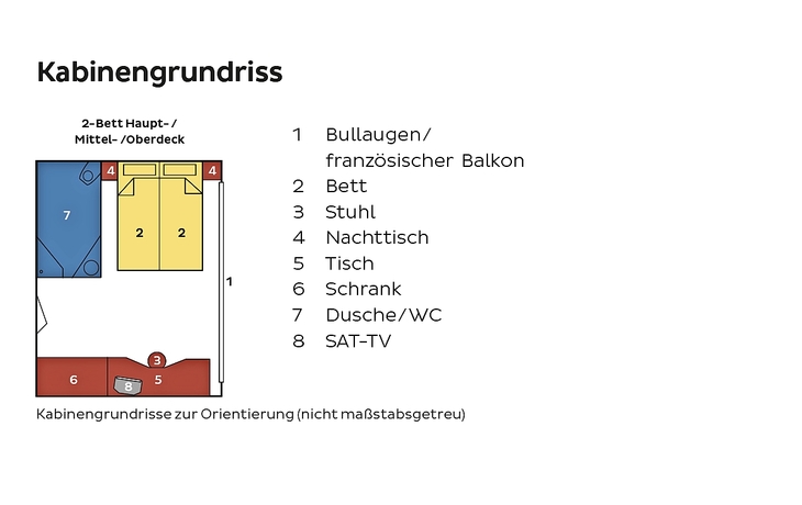 Unsere Partnerreederei versucht, Ihre Kabinenwünsche innerhalb Ihrer gebuchten Kategorie zu berücksichtigen, was jedoch nicht immer gelingt.