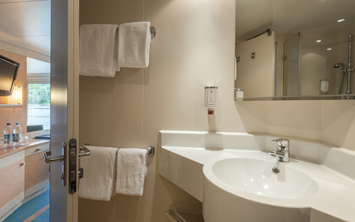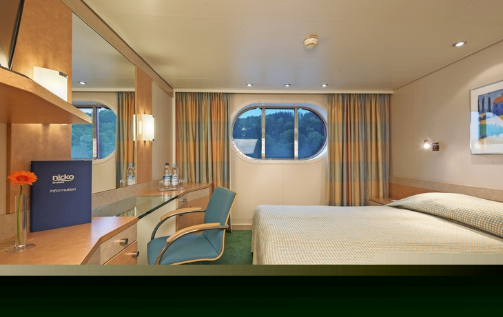 Alle Kabinen sind stilvoll und komfortabel eingerichtete Außenkabinen und verfügen über Dusche/WC, Haartrockner, Sat-TV mit Radio, Kühlschrank, Safe, Telefon und eine individuell regulierbare Klimaanlage. Die Kabinen wurden im Winter 2024/25 erneuert. Mit ca. 16 m² Große, bieten sie nebeneinanderstehende Betten, die auf Wunsch getrennt gestellt werden können. Die Kabinen auf dem Mittel- und Oberdeck verfügen über bis zum Boden reichende Panoramafenster zum Öffnen (französischer Balkon), die Kabinen auf dem Hauptdeck über große, nicht zu öffnende Bullaugen.