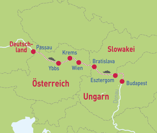 Passau – Krems – Esztergom – Budapest – Bratislava – Wien – Ybbs – Passau