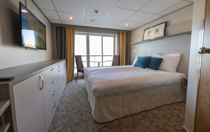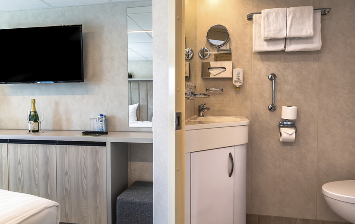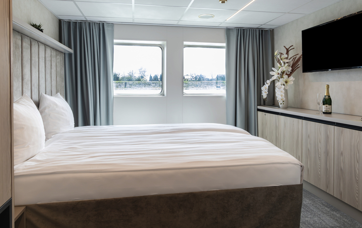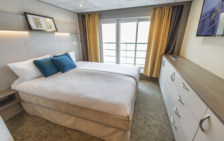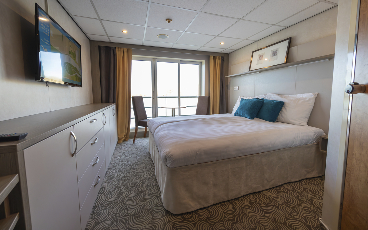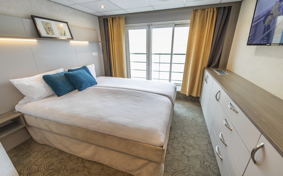 Die 14 m² großen, komfortablen Kabinen sind außenliegend und mit Dusche/WC, TV, Klimaanlage (individuell regulierbar), Telefon, Safe und Haartrockner ausgestattet. Die Suiten auf dem Oberdeck sind 21 m² groß. Alle Kabinen auf dem Oberdeck und Mitteldeck Superior verfügen über einen französischen Balkon, die Fenster auf dem Hauptdeck und Mitteldeck Standard sind nicht zu öffnen. Alle Kabinen sind mit Doppelbetten ausgestattet, die auch getrennt gestellt werden können.