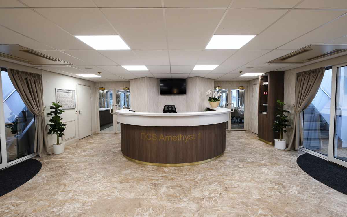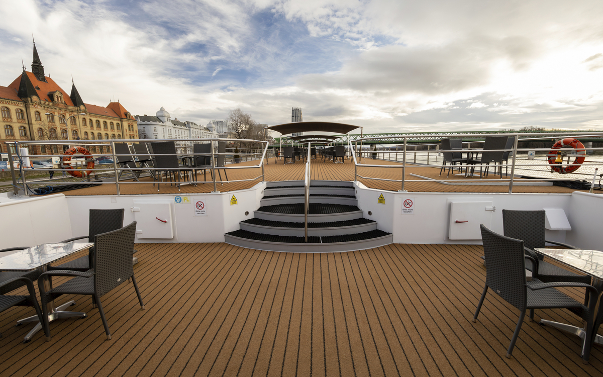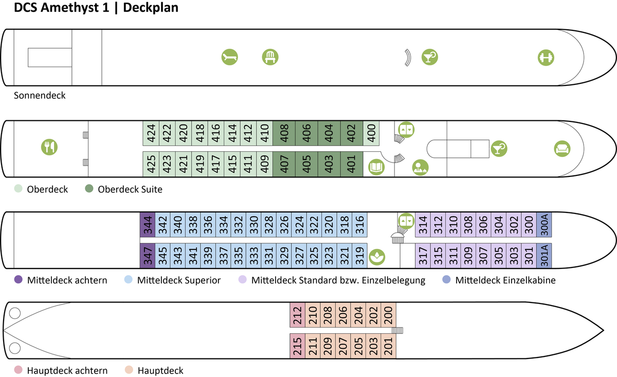Sie wollen sich so richtig entspannen und dabei komfortabel reisen? Dann laden wir Sie ein auf unsere elegante und zeitlos schöne DCS "Amethyst 1" auf der Donau. Auf dem Oberdeck befinden sich das einladende Panoramarestaurant sowie eine Bar und Bibliothek. Außerdem steht ein Sonnendeck mit Liegestühlen sowie Fitnessgeräte zur Verfügung. Ein Lift verbindet das Mittel- und Oberdeck. Die Bordwährung ist Euro, die Zahlung erfolgt bar oder mittels Kreditkarte (Visa- und Euro-/Mastercard sowie in Deutschland ausgestellte EC-Karten mit PIN). Auf dem gesamten Schiff ist WLAN verfügbar (kostenpflichtig), die Stromspannung ist 220 V.