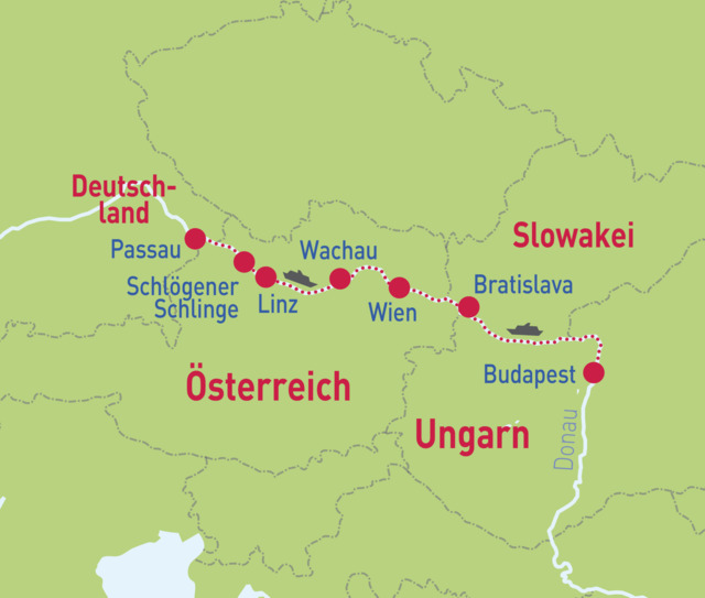 Die Donau ist einer der beliebtesten Flüsse Europas. Auf ihrem 2.800 km langen Weg vom Schwarzwald bis zum Schwarzen Meer berührt sie eine Vielzahl von Ländern und verbindet viele landestypische Traditionen zu einem bunten Reigen vielfältigster Erlebnisse. Erleben Sie mit "Weltenbummler" die Donau zur schönsten Reisezeit, gleiten Sie durch vier europäische Länder, besichtigen Sie die drei großen europäischen Metropolen – Wien, Budapest und Bratislava. Abwechslungsreiche Landschaften, u.a. die Donauschlinge bei Schlögen, die sagenumwobene Wachau und das reizvolle Donauknie bei Esztergom werden auch Sie faszinieren.