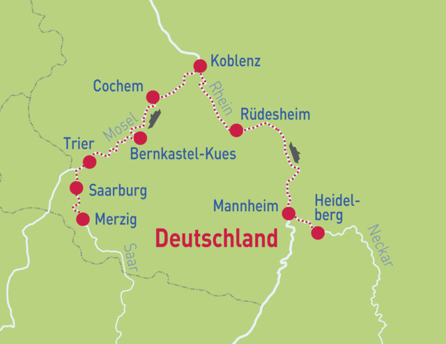 Merzig – Saarburg – Trier – Bernkastel-Kues – Cochem – Koblenz – Rüdesheim – Heidelberg – Mannheim
