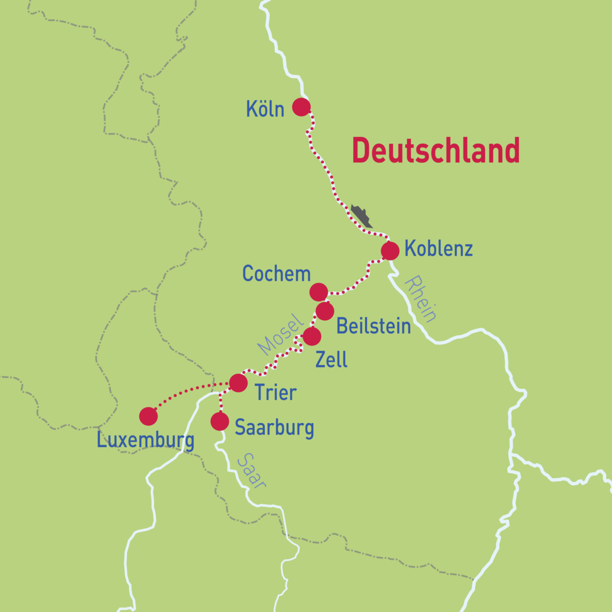 Köln – Beilstein – Trier – Luxemburg – Saarburg – Saarschleife – Zell – Cochem – Koblenz – Köln