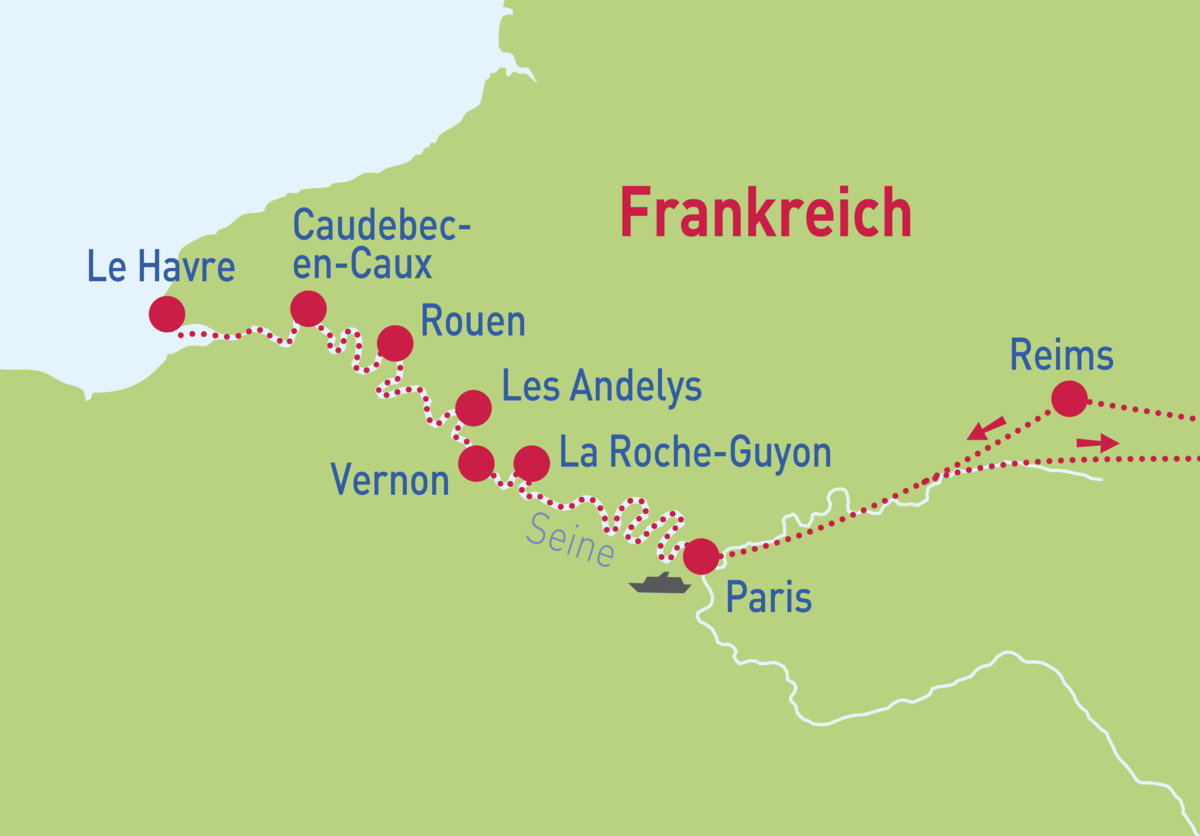 Diese stilvolle Reise mit der A-ROSA VIVA verbindet französische Lebensart, Kultur und Landschaftsgenuss. Nach einem genussvollen Auftakt in Reims heißt es Leinen los in Paris – und auf der Seine entdecken Sie die Normandie mit Orten wie Rouen, Le Havre und Les Andelys, charmantem Flair und eindrucksvollen Ausblicken.
