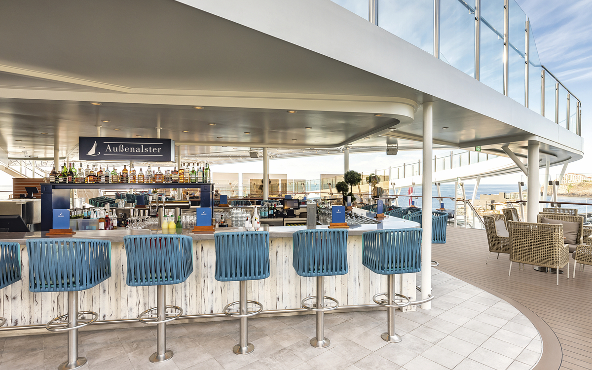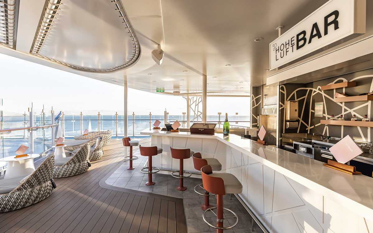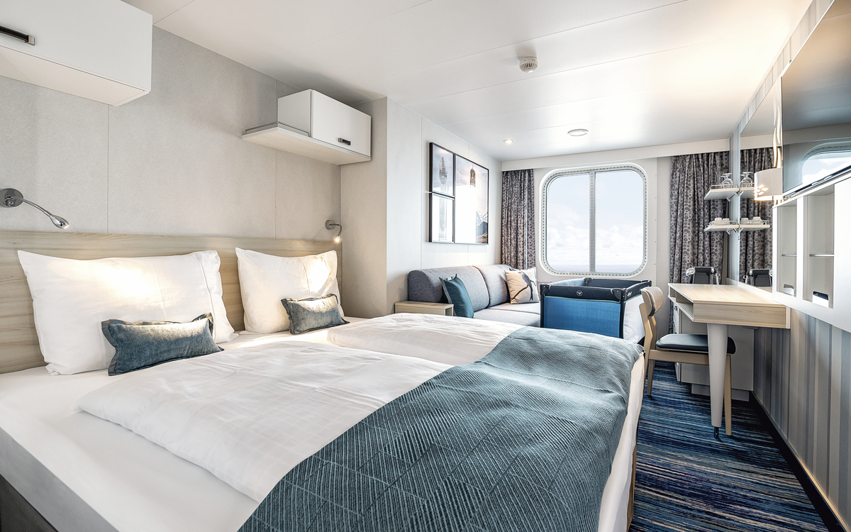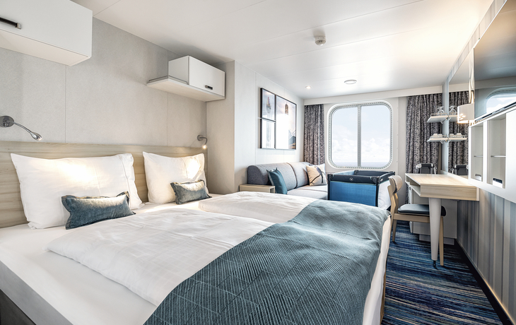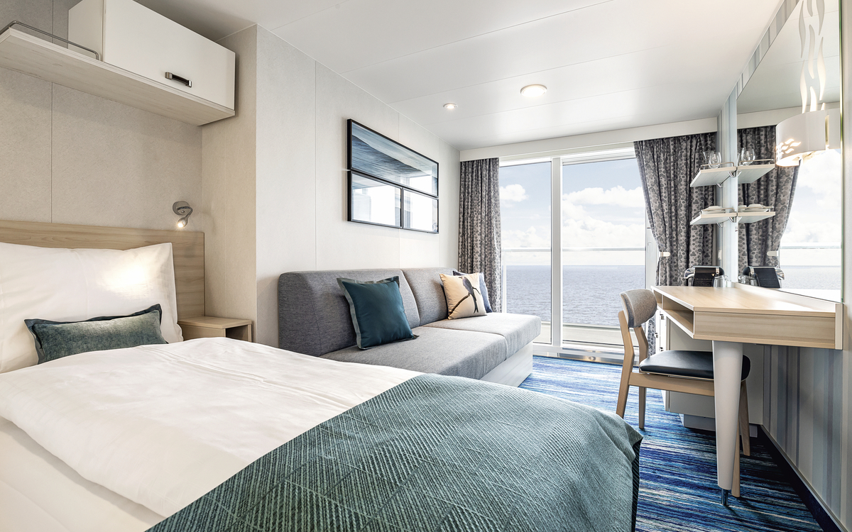 Die modern, hell und freundlich eingerichteten Innen- und Außenkabinen verfügen über Klimaanlage/Heizung, Bad mit Dusche/WC, Föhn, Leihbademäntel, Espresso-Maschine, Flachbildschirm, Telefon, Safe und zwei einzelnen unteren Betten, die zu einem Doppelbett arrangiert werden können. Die Balkonkabinen bieten zusätzlich raumhohe Glastüren, die zu einem ca. 5 m² großen privaten Balkon mit einem Tisch und 2 Stühlen führen.