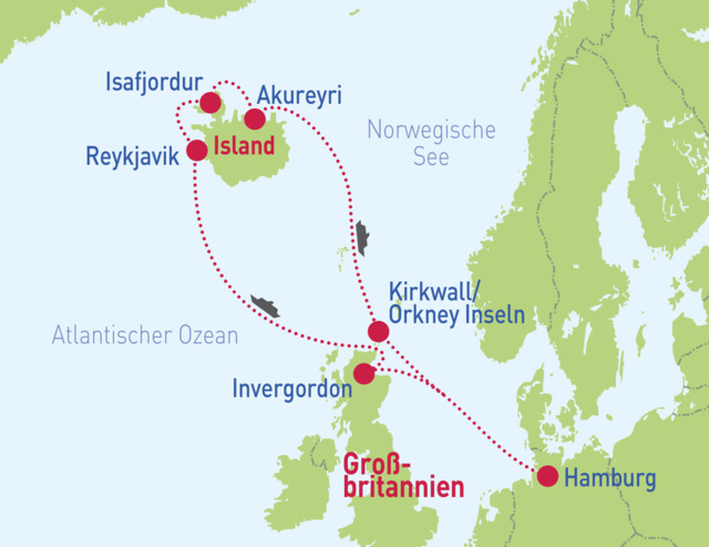 Hamburg – Invergordon – Reykjavik – Ísafjörður – Akureyri – Orkney Inseln – Hamburg