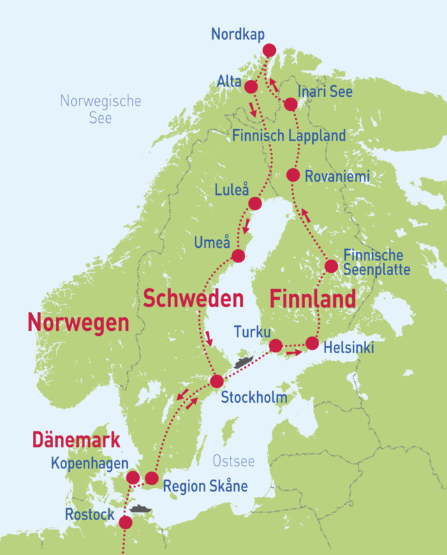 Es ist der Sehnsuchtsort vieler Nordlandfahrer – das Nordkap, der nördlichste Punkt Europas. Kommen Sie mit "Weltenbummler" dorthin und erleben Sie unterwegs Dänemark, Schweden, Finnland und Norwegen. Hier findet der Besucher einen Mix aus grandioser Natur, Ursprünglichkeit und alten Geschichten von Trollen und anderen mystischen Wesen. Auf Ihrer Fahrt zum Nordkap überqueren Sie den Polarkreis. Auf der Nordkap-Insel angekommen bleibt es nicht bei einer kurzen Visite, sondern Sie übernachten auch dort. Eine Tour voller wundervoller Eindrücke und vieler einmaliger Fotos erwartet Sie.