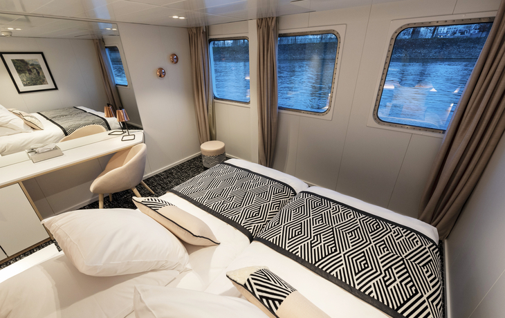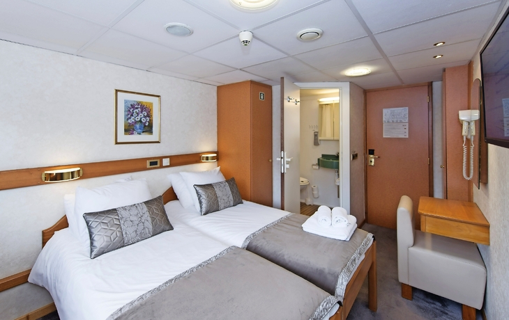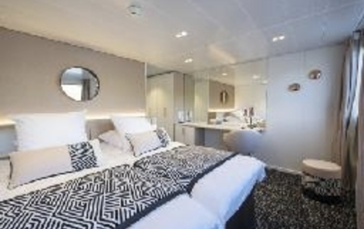 Bei allen Kabinen handelt es sich um Außenkabinen mit einer Grundfläche von 11-14 m². Alle Kabinen verfügen über zwei untere Betten, die entweder getrennt oder zusammenliegend angeordnet sind. Zur Ausstattung gehören Dusche/WC, TV, Safe, Haustelefon und eine individuell regulierbare Klimaanlage. Die Kabinen haben Panoramafenster, die Oberdeck-Kabinen verfügen über einen französischen Balkon.