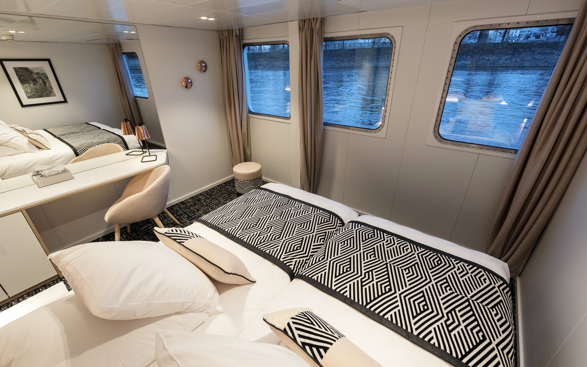 Bei allen Kabinen handelt es sich um Außenkabinen mit einer Grundfläche von ca. 12 m². Alle Kabinen verfügen über zwei unteren Betten, die getrennt oder zusammenliegend angeordnet sind. Zur Ausstattung gehören Dusche/WC, Haartrockner, TV, Safe, Haustelefon und eine individuell regulierbare Klimaanlage. Die Kabinen haben große Panoramafenster, die auf dem Oberdeck zur Hälfte aufzuschieben gehen.