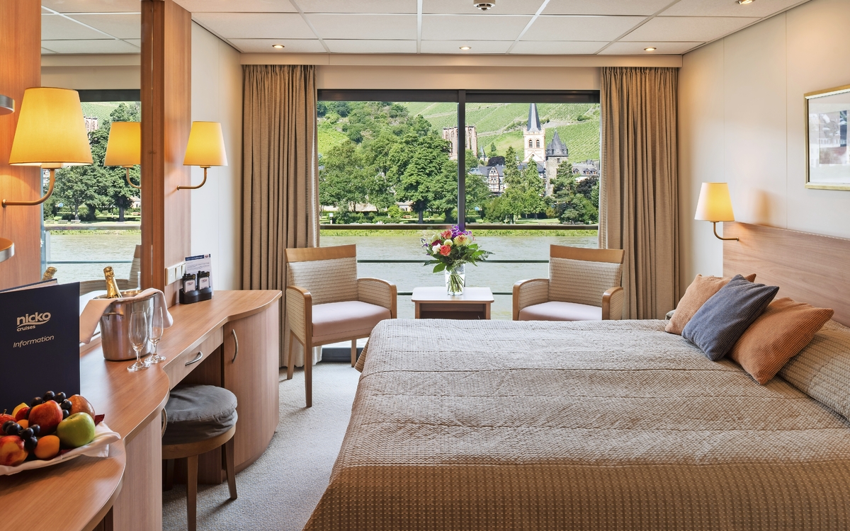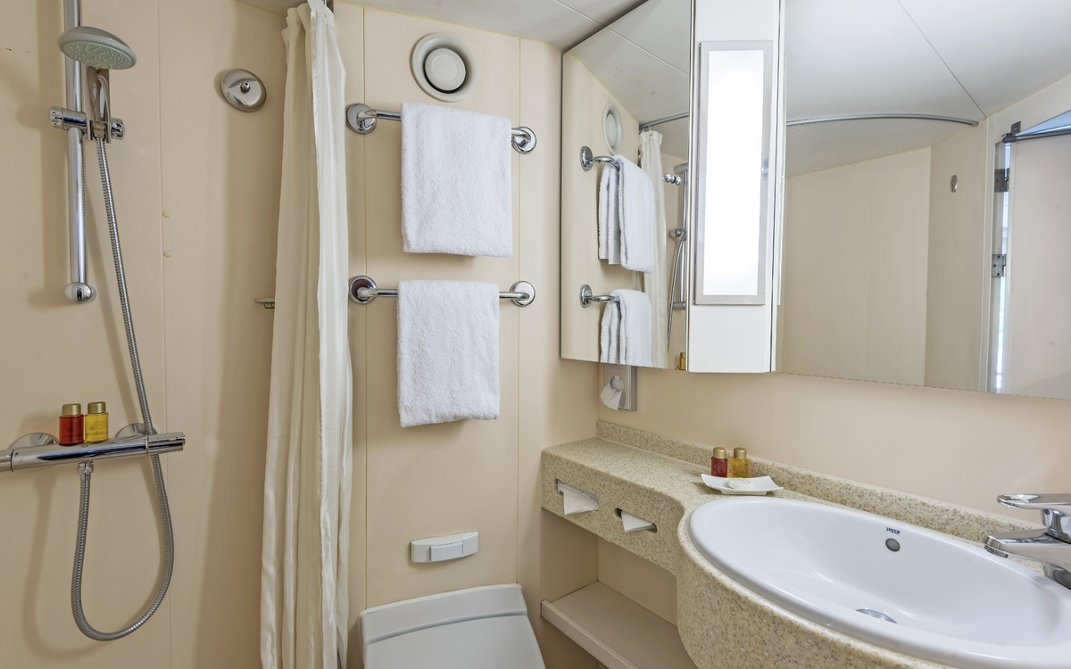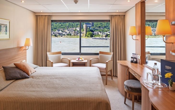 Alle stilvoll und komfortabel eingerichteten Kabinen sind Außenkabinen und verfügen über eine individuell regulierbare Klimaanlage, Dusche/WC, Haartrockner, Safe und Telefon. Die Kabinen sind ca. 14,5 m² groß. Sie bieten nebeneinanderstehende Betten, die auf Wunsch getrennt gestellt werden können. Auf dem Oberdeck verfügen die Kabinen über bis zum Boden reichende Panoramafenster zum Öffnen (französischer Balkon), die Kabinen auf dem Mitteldeck haben große zu öffnende Panoramafenster. Die Hauptdeck Kabinen verfügen über nicht zu öffnende Aussichtsfenster. Die Kabinen Hauptdeck, achtern sind ca. 11,5 m² groß und sind alle mit einem Klappbett und einem Sofabett ausgestattet.