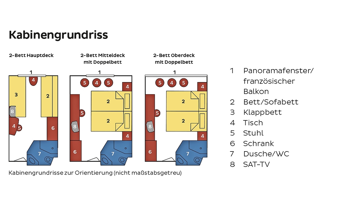Unsere Partnerreederei versucht, Ihre Kabinenwünsche innnerhalb Ihrer gebuchten Kategorie zu berücksichtigen, was jedoch nicht immer gelingt.