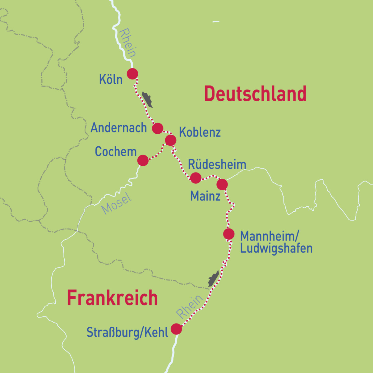 Köln – Mainz – Mannheim/Ludwigshafen – Straßburg/Kehl – Rüdesheim – Koblenz – Andernach – Köln