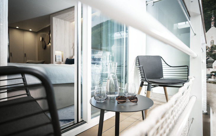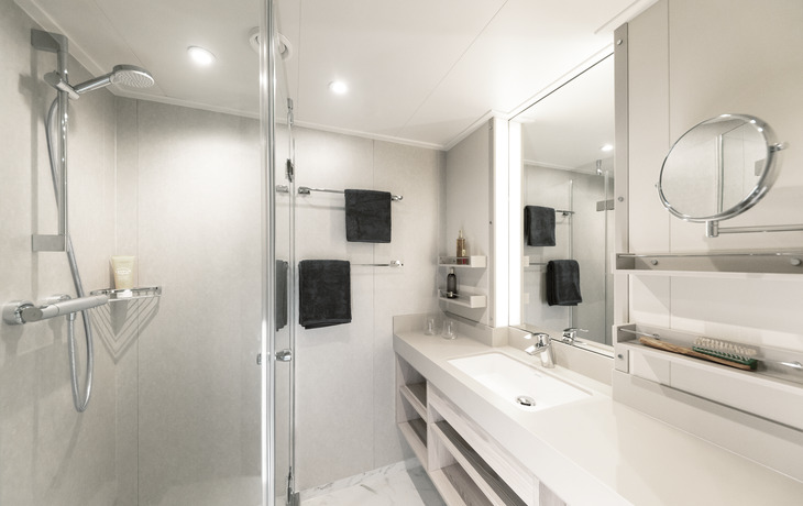 Alle Kabinen sind außenliegend und (je nach Kategorie) mit 21-31 m² sehr großzügig geschnitten, somit sehr komfortabel. Das elegante Design und die edlen Materialien sprechen für sich. Alle Standardkabinen mit 21 m² und Suiten mit 26-31 m² verfügen über einen begehbaren Balkon. Die Ausstattung inkludiert Dusche/WC, Haartrockner, Telefon, TV, Klimaanlage und Safe. Die Kabinen auf dem Deck 2 und 3 verfügen über einen französischen Balkon, die Fenster auf Deck 1 sind nicht zu öffnen. Zudem sind alle Kabinen mit Doppelbetten ausgestattet.