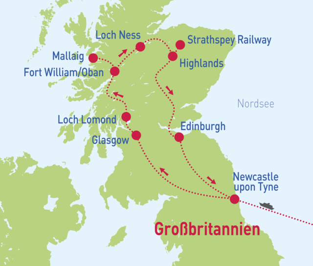Abfahrt von den Ausgangsorten am frühen Morgen. Anreise nach Amsterdam. Anschließend Fährüberfahrt nach Newcastle. Übernachtung an Bord.