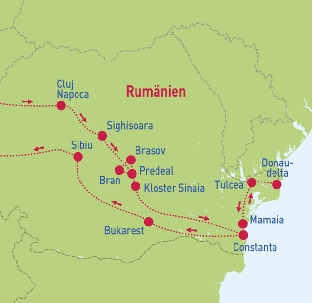 Siebenbürgen verzaubert seine Gäste mit wunderschönen Kirchenburgen, verträumten Dörfern, historisch gewachsenen Städten und traumhaft schönen Landschaften. Durch dieses Gebiet führt Sie unsere Reise bis an die Schwarzmeerküste. Hier bahnt sich die Donau nach beinahe dreitausend Kilometern ihren Weg ins Schwarze Meer. Das Delta ist ein einzigartiges Labyrinth aus Wasser, Land und Schilf, verteilt auf fast 5.000 km². Ein einmalig schönes Naturparadies.