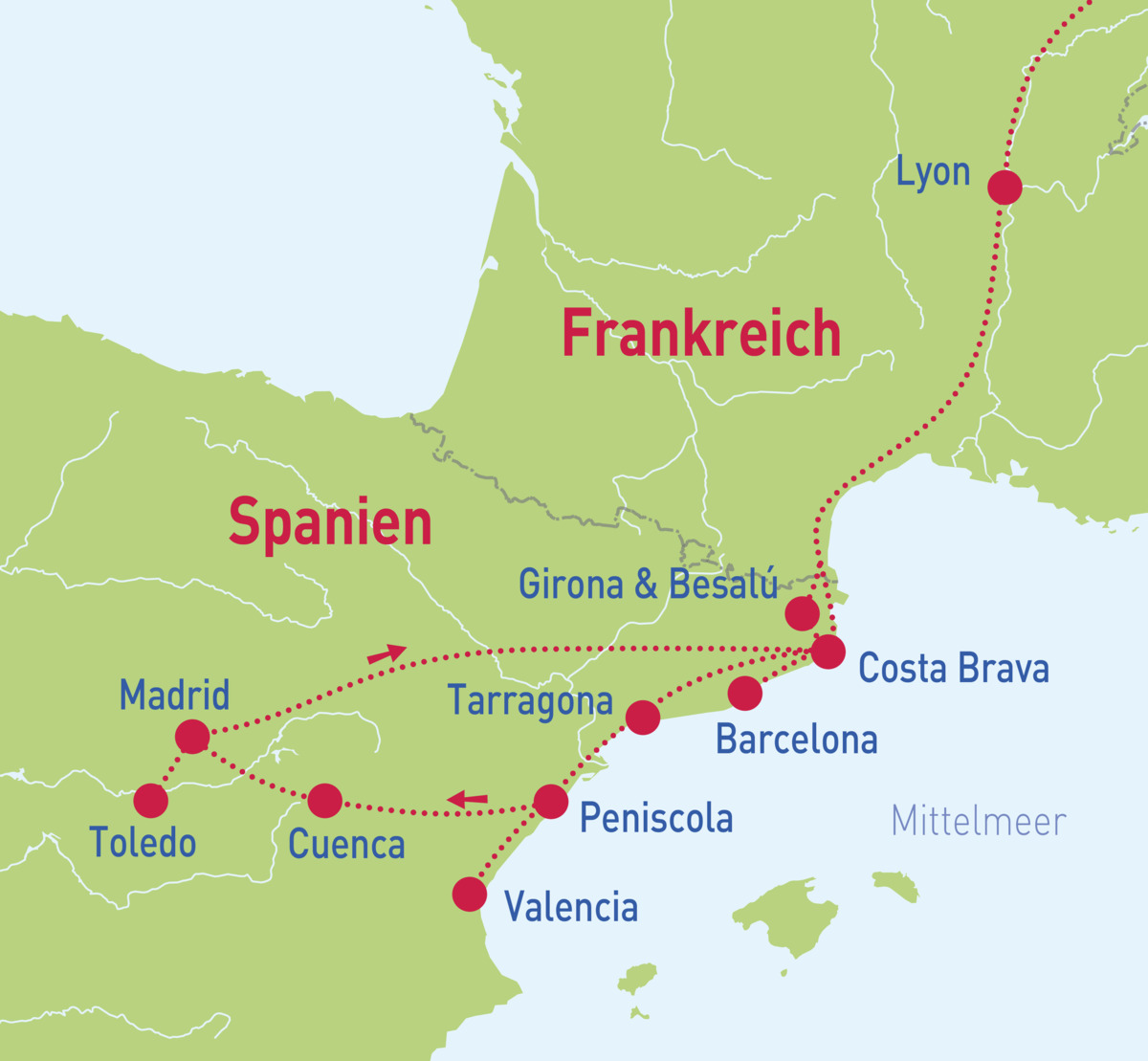 Spanien ist ein Land voller Kontraste: mittelalterliche Städte und pulsierende Metropolen, stille Dörfer und lebendige Märkte, weite Landschaften und das glitzernde Mittelmeer. Auf dieser Reise folgen Sie einem abwechslungsreichen Weg von der Costa Brava bis nach Madrid. Unterwegs begegnen Sie der römischen Geschichte, barocken Plätzen, gotischen Kathedralen und dem spanischen Lebensgefühl, das sich bei einem Bummel über die Ramblas oder durch enge Gassen besonders eindrücklich zeigt. So entsteht ein Kaleidoskop an Eindrücken – kompakt, vielfältig und unvergesslich.