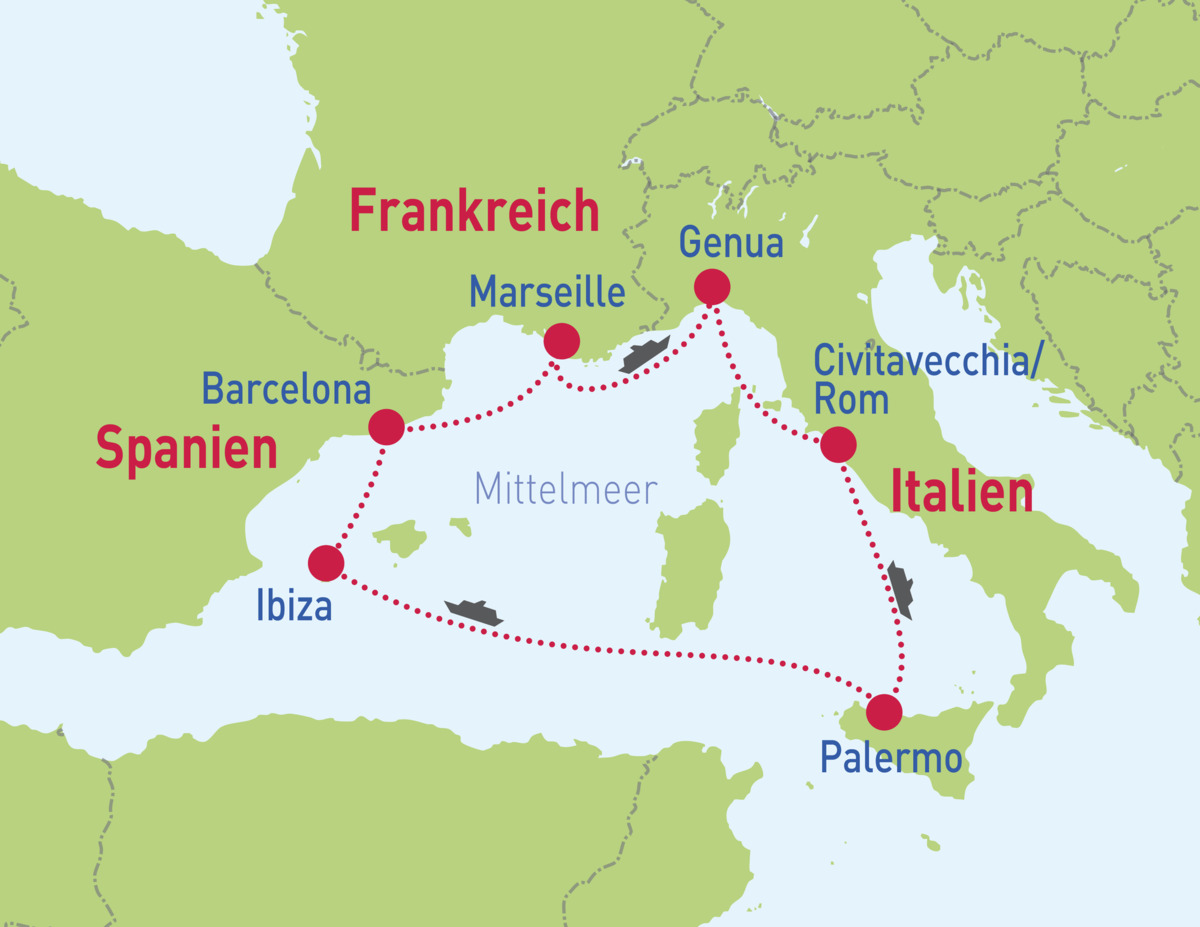Genua – Civitavecchia (Rom) – Palermo – Ibiza – Barcelona – Marseille – Genua