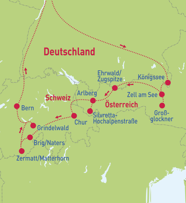 Eine spektakuläre Reise erwartet Sie, bei der sich jeden Tag ein neuer Höhepunkt bietet. Wie an einer Perlenkette aufgereiht präsentieren sich Ihnen majestätische Gipfel, weit ausladende Täler und glitzernde Seen. Atemberaubende Ausblicke wechseln sich ab mit dem Brauchtum Süddeutschlands, Österreichs und der Schweiz. Erleben Sie die Traumgipfel der Alpen in einer völlig neuen Kombination.