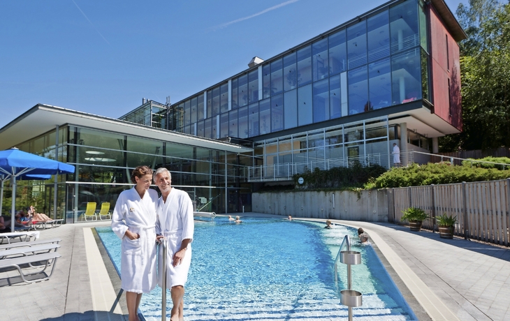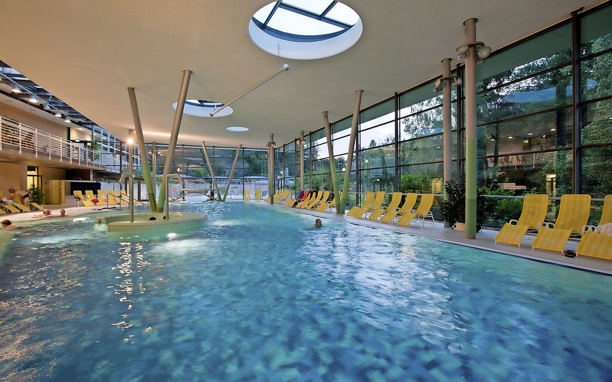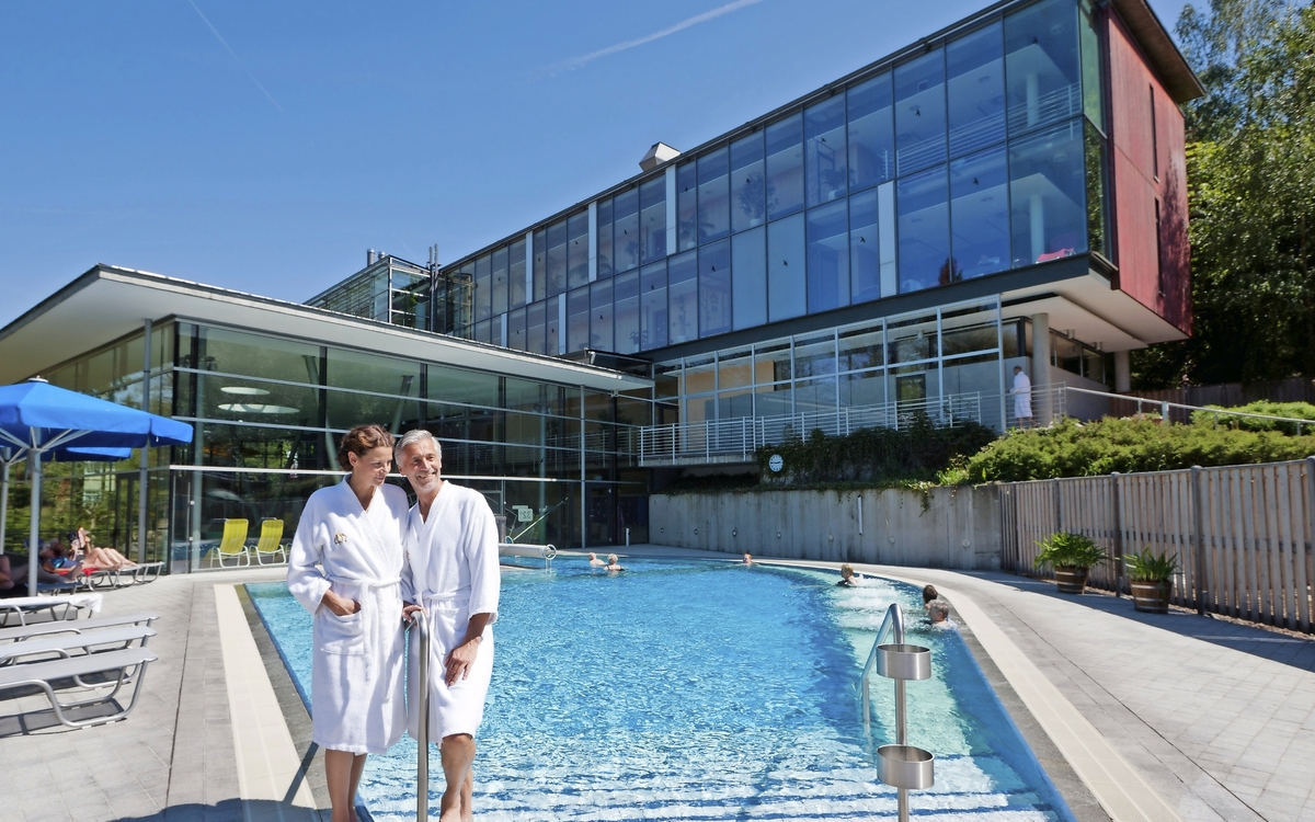 Ein Bademantelgang führt Sie trockenen Fußes direkt vom Hotel in das moderne Therapiezentrum und die Bade- und Saunalandschaft Bad Brambach. Auf ca. 5.000 m² Fläche stehen Ihnen ein 260 m² großes Innenbecken, Whirlpool, Nackenduschen, Bodensprudler und Außenbecken mit einer konstanten Wassertemperatur von 32°C zur Verfügung. Ein Wohlfühlerlebnis für alle Sinne verspricht das gemütliche Saunadorf. Hier haben Sie die Wahl zwischen verschiedenen
